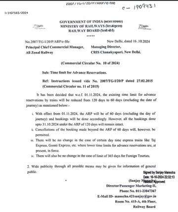 रेलवे से रोजाना लाखों लोग यात्रा करते हैं, और इसके लिए उन्हें टिकट बुक करवाने की प्रक्रिया का अच्छी तरह से ज्ञान होना आवश्यक है। पहले, यात्री अपनी टिकट 120 दिन पहले बुक करवा सकते थे, लेकिन अब रेलवे ने रिजर्वेशन में एक महत्वपूर्ण बदलाव किया है। अब से यात्री केवल 60 दिन पहले ही टिकट बुक कर सकेंगे। इस बदलाव का उद्देश्य यात्रियों को अधिक लचीलापन और सुविधा प्रदान करना है। रेलवे द्वारा जारी नोटिफिकेशन के अनुसार, यह नया नियम 1 नवंबर से लागू होगा। इसके तहत, 1 नवंबर से एडवांस रिजर्वेशन की समय सीमा 120 दिन से घटकर 60 दिन हो जाएगी।